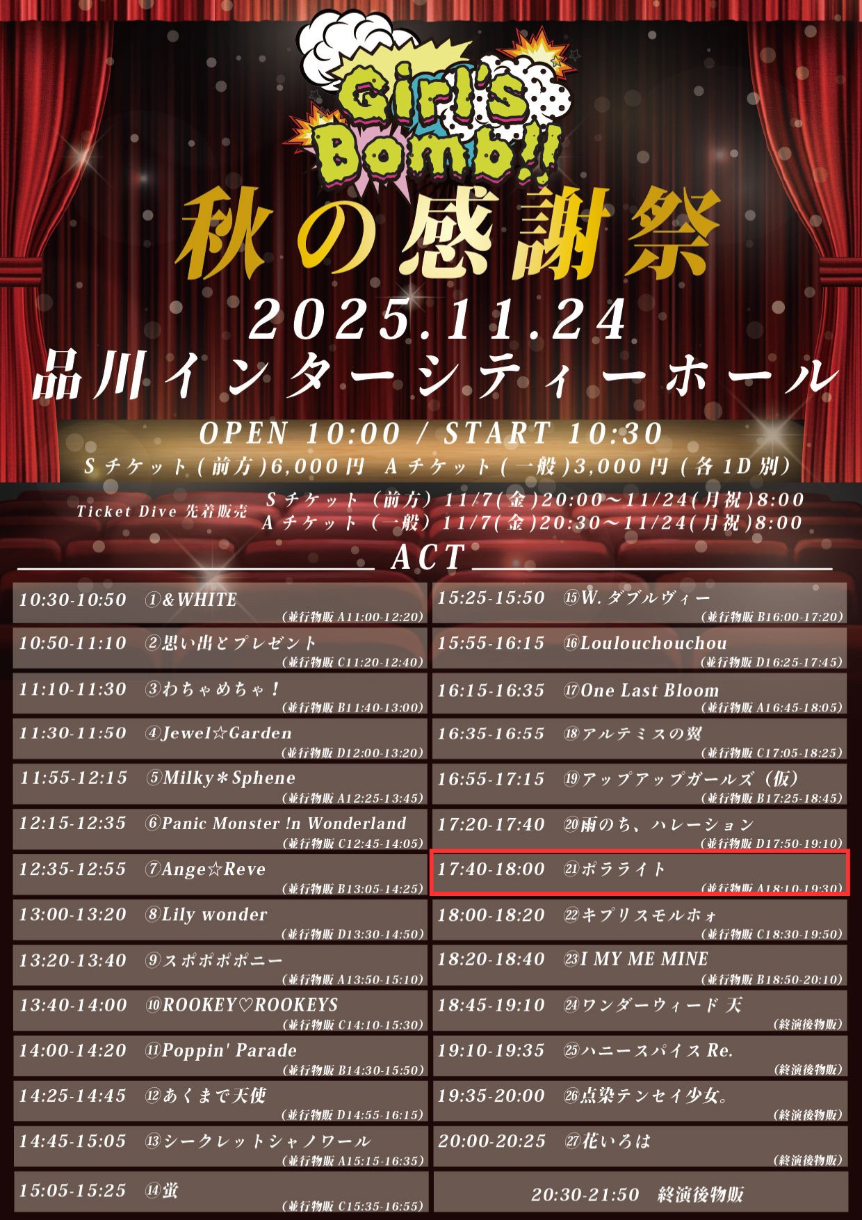 ワンダーウィード天 / 花いろは / One Last Bloom / 点染テンセイ少女。 / ハニースパイスRe. / アルテミスの翼 / I MY ME MINE / アップアップガールズ(仮) / 雨のち、ハレーション / シークレットシャノワール / Poppin' Parade / ポラライト / Panic Monster !n Wonderland / Ange☆Reve / Jewel☆Garden / Milky*Sphene / スポポポポニー / Lily wonder / &White / キプリスモルホォ / Loulouchouchou / ROOKEY♡ROOKEYS / あくまで天使 / 蛍 / わちゃめちゃ! / 思い出とプレゼント