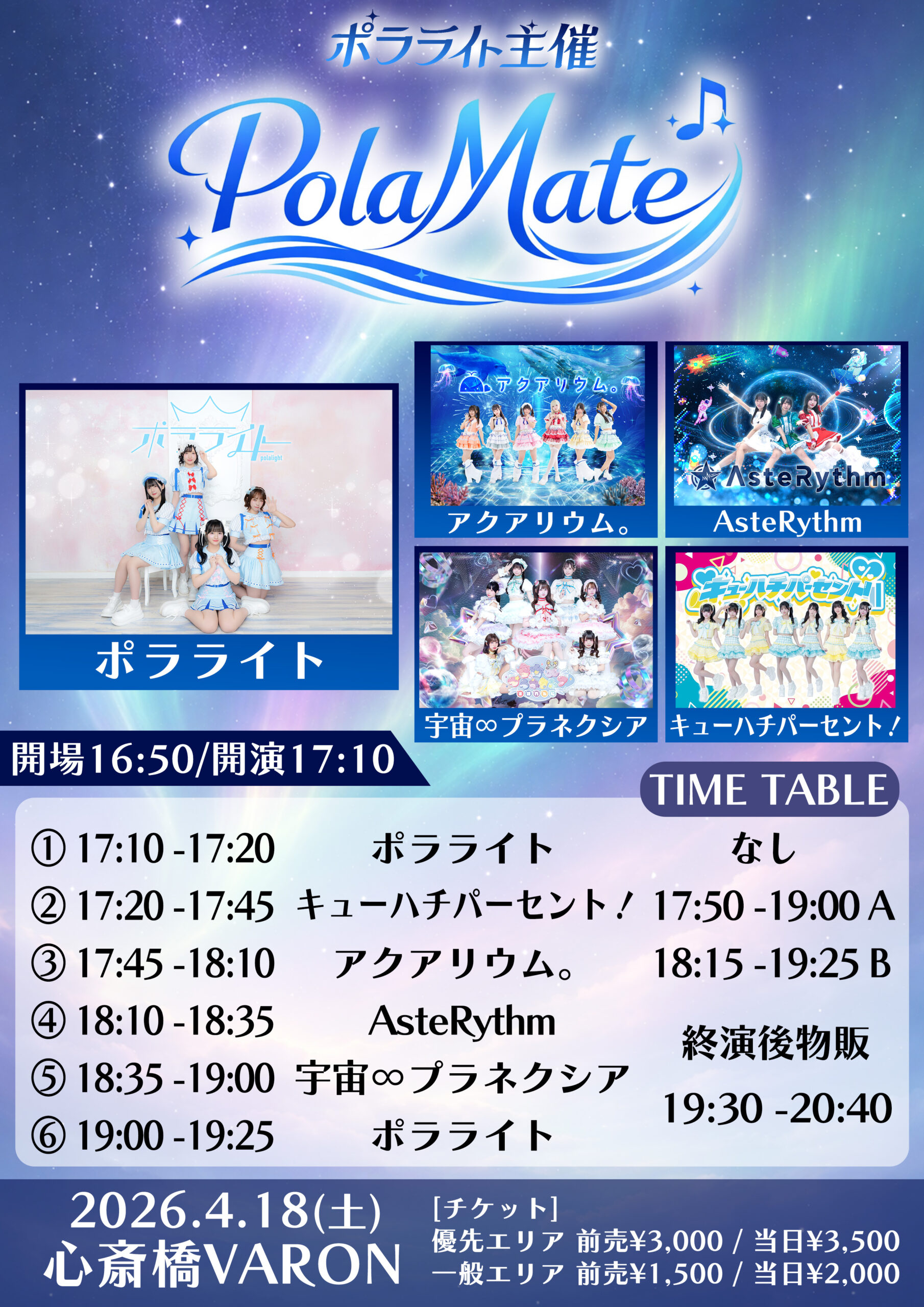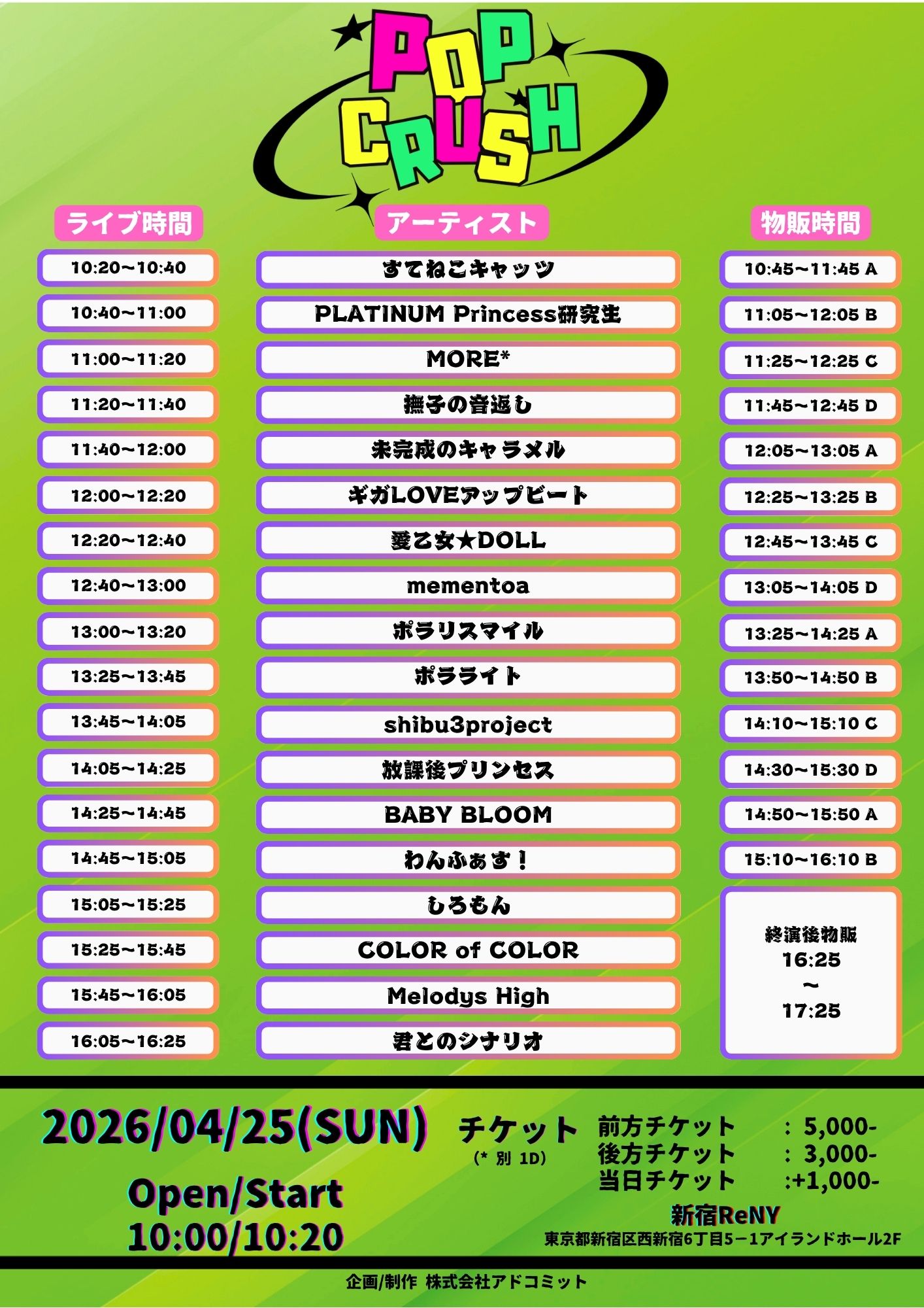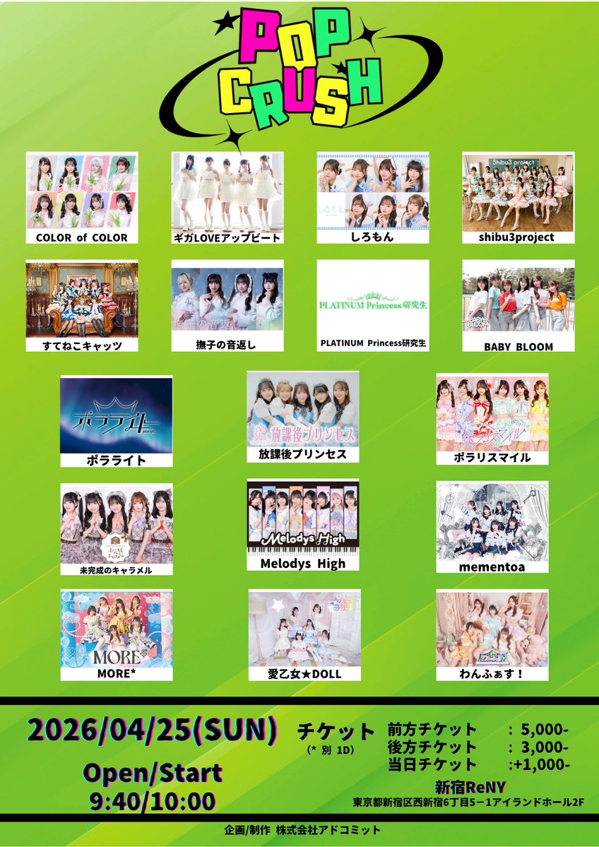 ポラリスマイル/Color of Color/未完成のキャラメル/PLATINUM Princess研究生/ギガLOVEアップビート/Melodys High/mementoa/すてねこキャッツ/撫子の音返し/しろもん/BABY BLOOM/わんふぁす!/ポラライト/shibu3project/放課後プリンセス/MORE*/愛乙女★DOLL