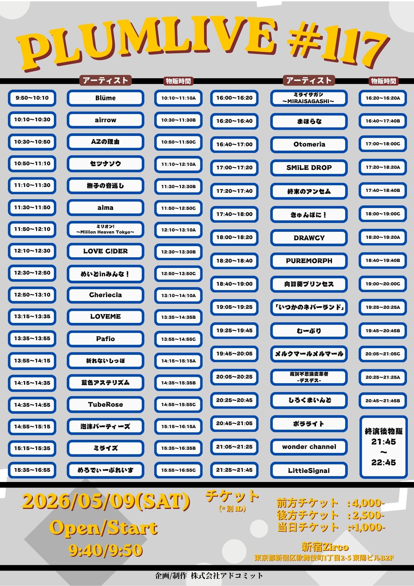泡沫パーティーズ/alma/LOVEME/airrow/撫子の音返し/向日葵プリンセス/ポラライト/ミライズ/DRAWCY/きゅんぱに!/終末のアンセム/TubeRose/wonder channel/折れないしっぽ/セツナソウ/メルクマールメルマール/PUREMORPH/LOVE C!DER/魔訶不思議変革者-デスデス-/「いつかのネバーランド」/ミリオン! 〜Million Heaven Tokyo〜/藍色アステリズム/まほらな/ミライサガシ~MIRAISAGASHI~/SMiLE DROP/Otomeria/しろくまいんど/めろでぃーぷれいす/LittleSignal/LIZZ/Pafio/AZの理由/めいどinみんな!/Cheriecla