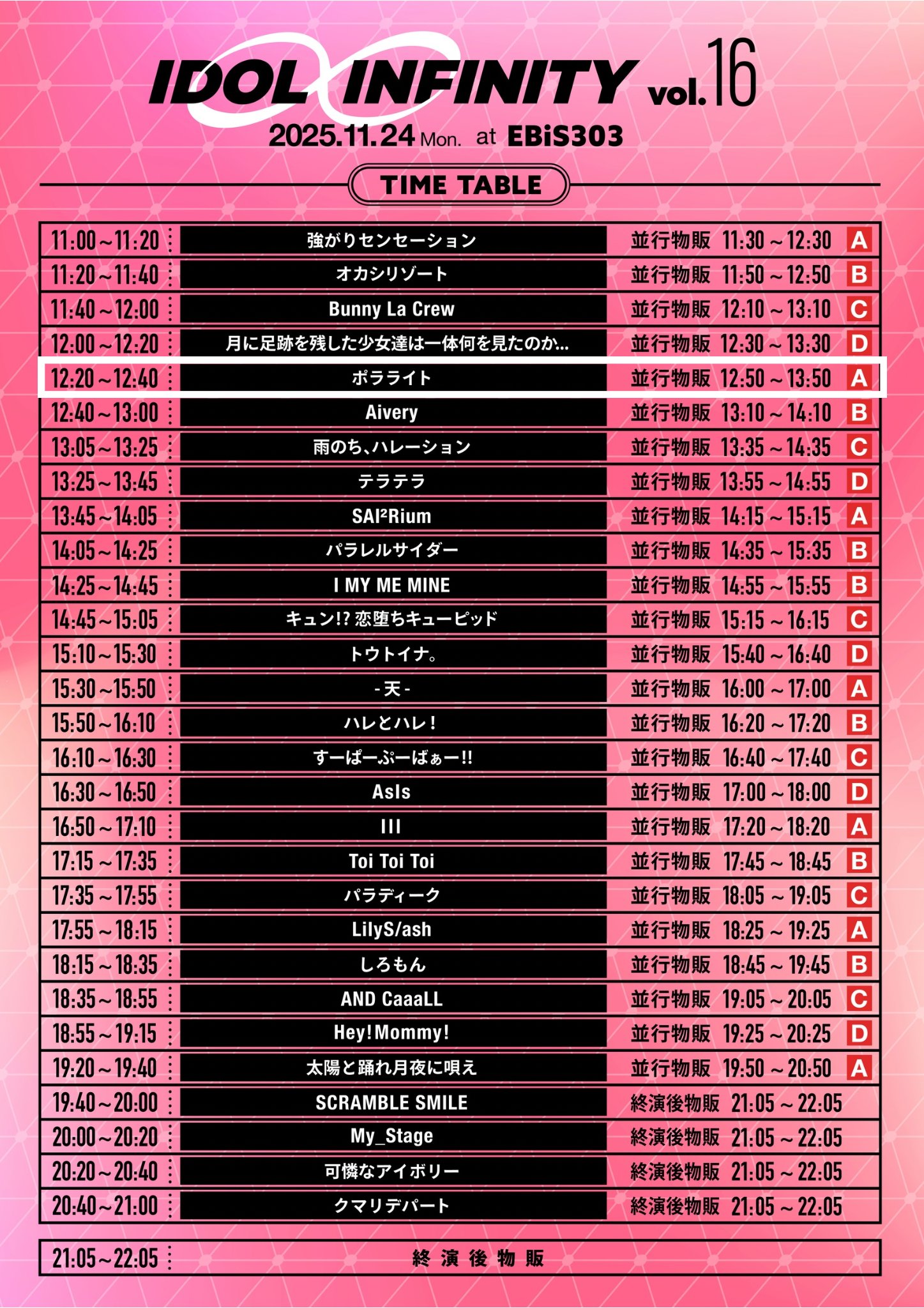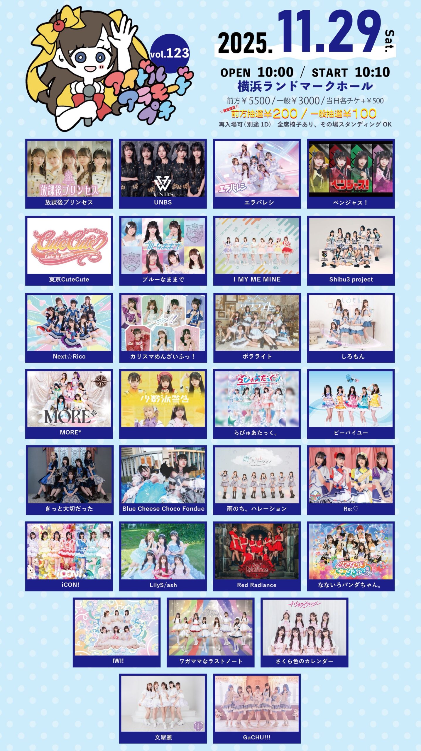 ワンダーウィード天 / 花いろは / One Last Bloom / 点染テンセイ少女。 / ハニースパイスRe. / アルテミスの翼 / I MY ME MINE / アップアップガールズ(仮) / 雨のち、ハレーション / シークレットシャノワール / Poppin' Parade / ポラライト / Panic Monster !n Wonderland / Ange☆Reve / Jewel☆Garden / Milky*Sphene / スポポポポニー / Lily wonder / &White / キプリスモルホォ / Loulouchouchou / ROOKEY♡ROOKEYS / あくまで天使 / 蛍 / わちゃめちゃ! / 思い出とプレゼント