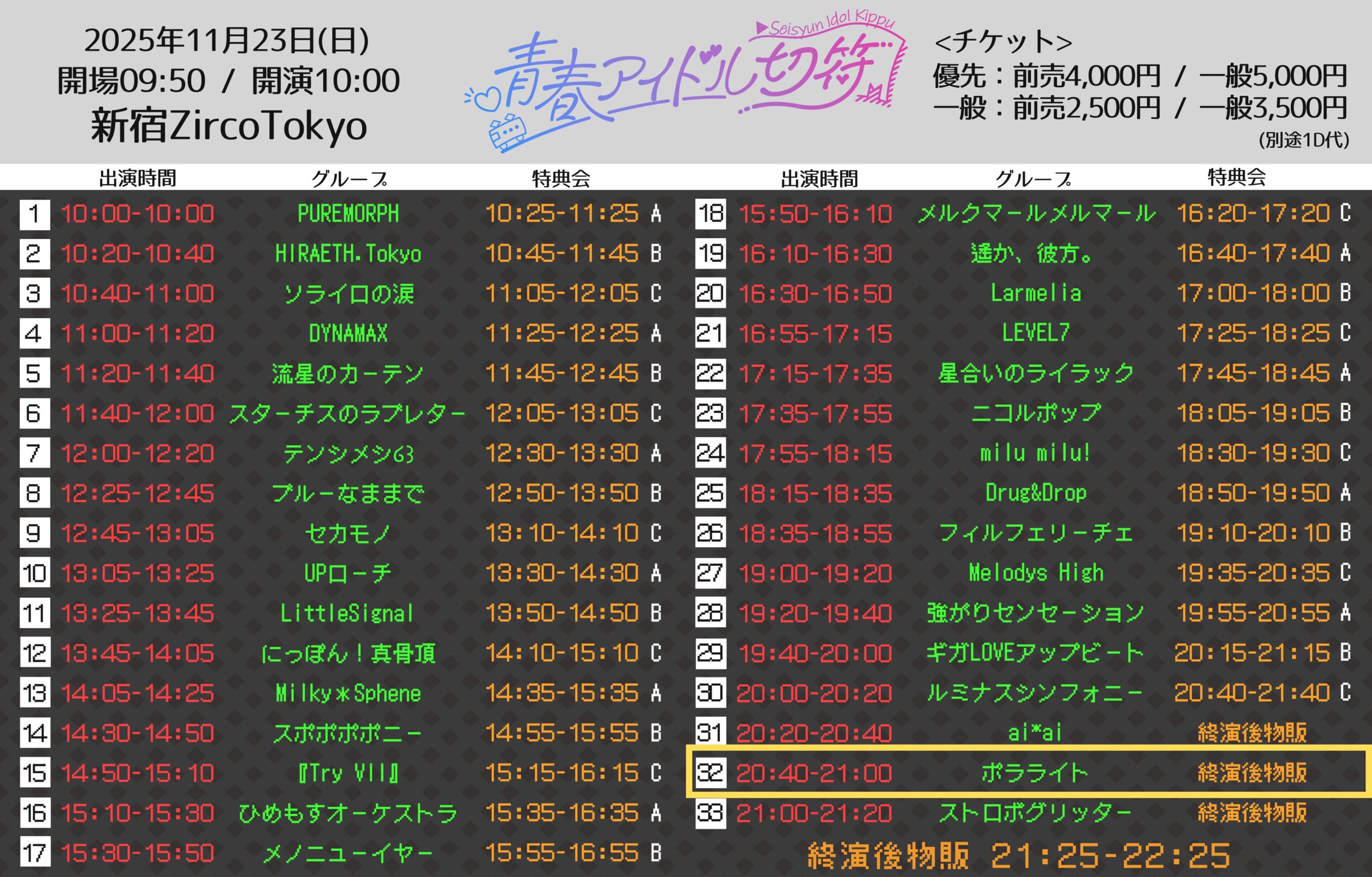 ai*ai / UPローチ / ギガLOVEアップビート / スターチスのラブレター / ストロボグリッター / スポポポポニー / セカモノ / ソライロの涙 / DYNAMAX / 強がりセンセーション / テンシメシ໒꒱ / 『Try VII』 / Drug&Drop / ニコルポップ / にっぽん!真骨頂 / 遥か、彼方。 / ひめもすオーケストラ / HIRAETH.Tokyo / フィルフェリーチェ / PUREMORPH / ブルーなままで / 星合いのライラック / ポラライト / Milky✳︎Sphene / milu milu! / メノニューイヤー / メルクマールメルマール / Melodys High / Larmelia / LittleSignal / 流星のカーテン / ルミナスシンフォニー / LEVEL7
