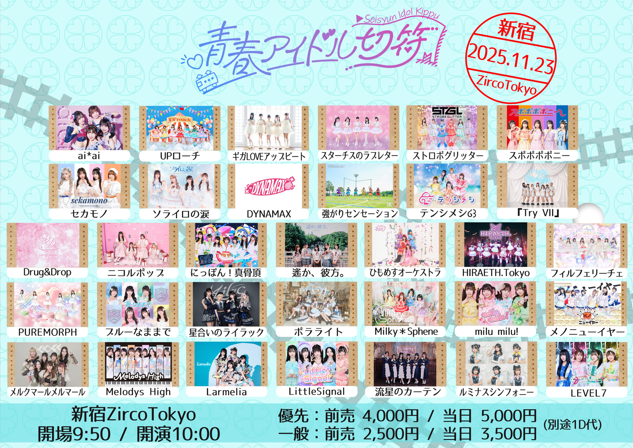 優先エリア¥4,000/一般¥2,500 / 当日各+¥1.000(各別途1D必須)